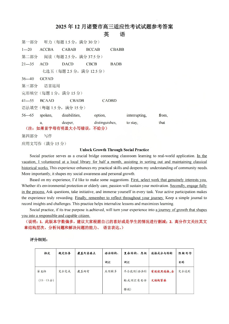 诸暨市2025年12月高三诊断性考试试题 英语答案.pdf