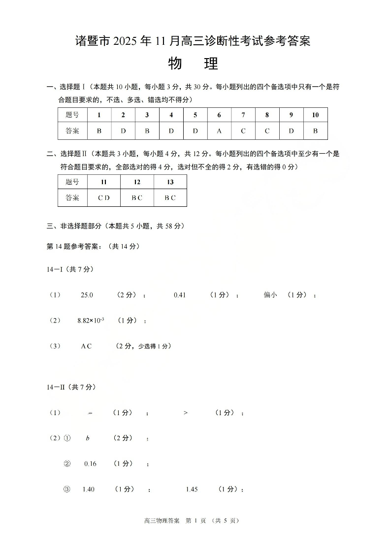 诸暨市2025年12月高三诊断性考试试题 物理答案.pdf