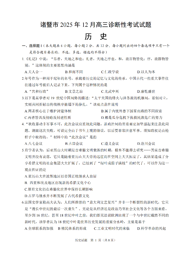 诸暨市2025年12月高三诊断性考试试题 历史.pdf