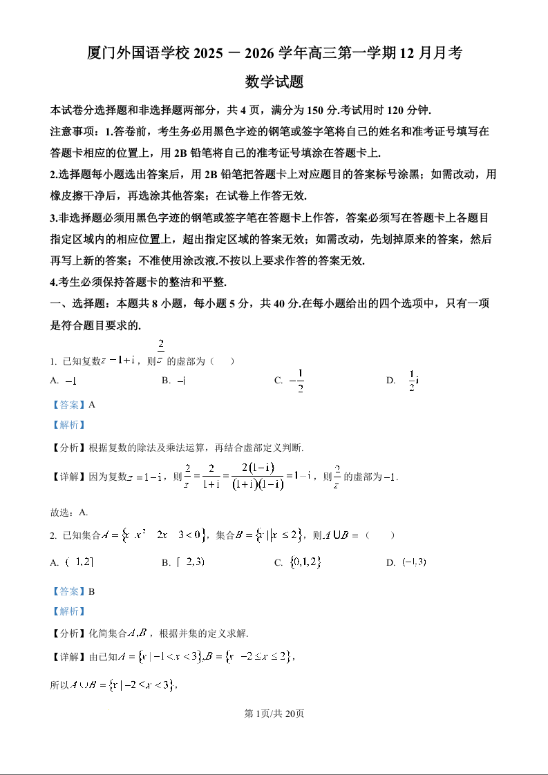厦门外国语学校2025-2026学年高三第一学期12月月考 数学答案.docx