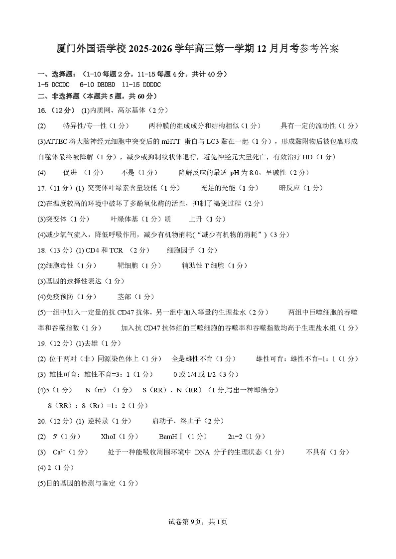 厦门外国语学校2025-2026学年高三第一学期12月月考 生物答案.pdf
