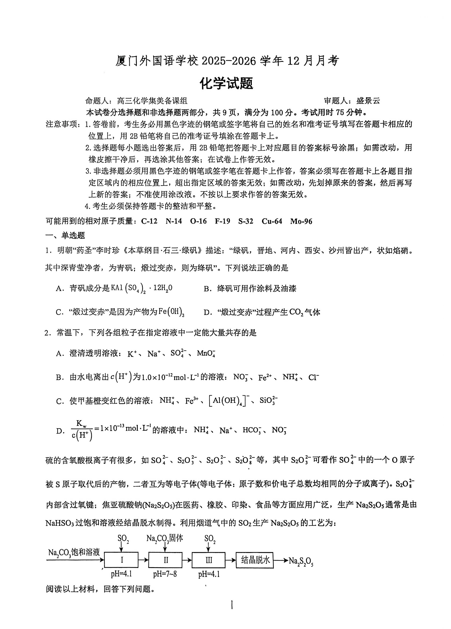 厦门外国语学校2025-2026学年高三第一学期12月月考 化学.pdf