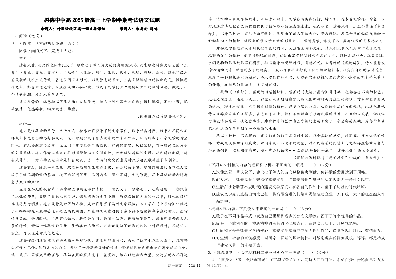 树德中学高2025级高一上学期半期考试 语文试题(含答案).pdf
