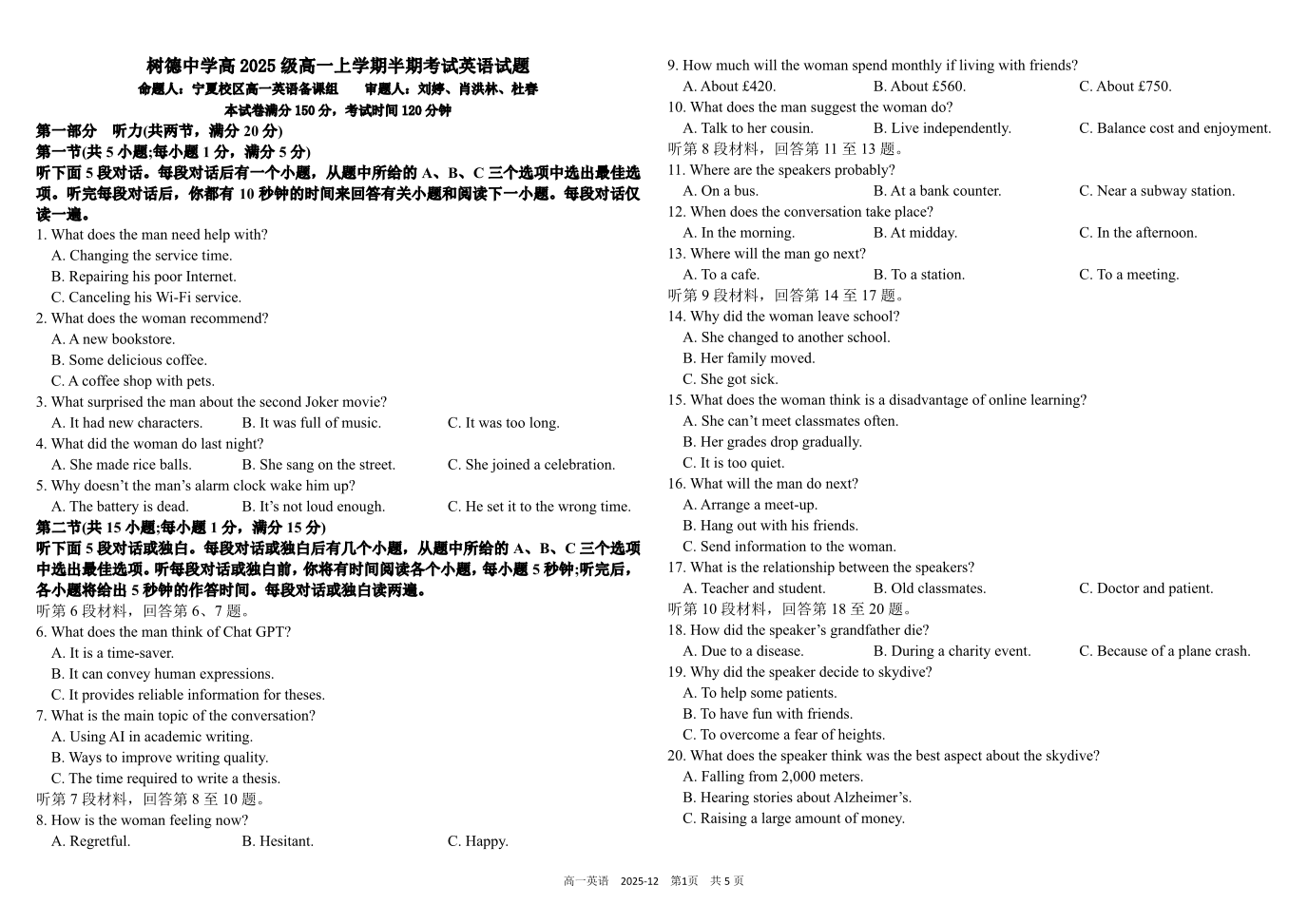 树德中学高2025级高一上学期半期考试 英语试题(含答案).pdf