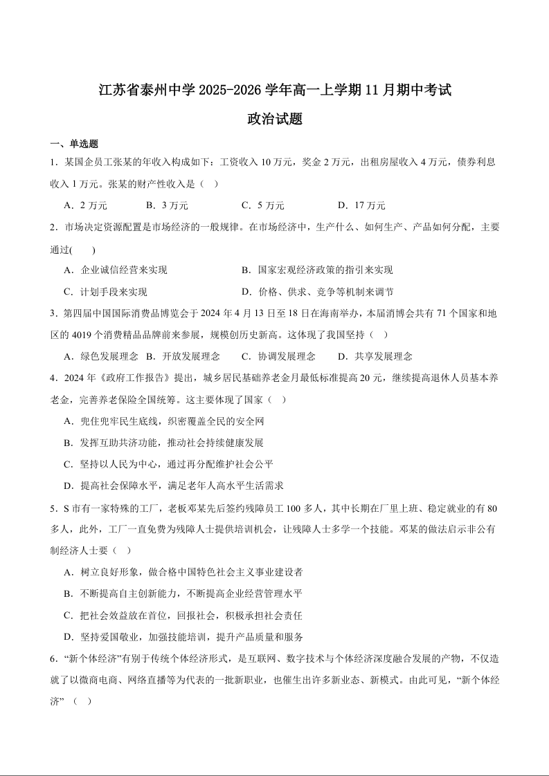 江苏省泰州中学2025-2026学年第一学期高一年级期中考试 政治试题(含答案).docx