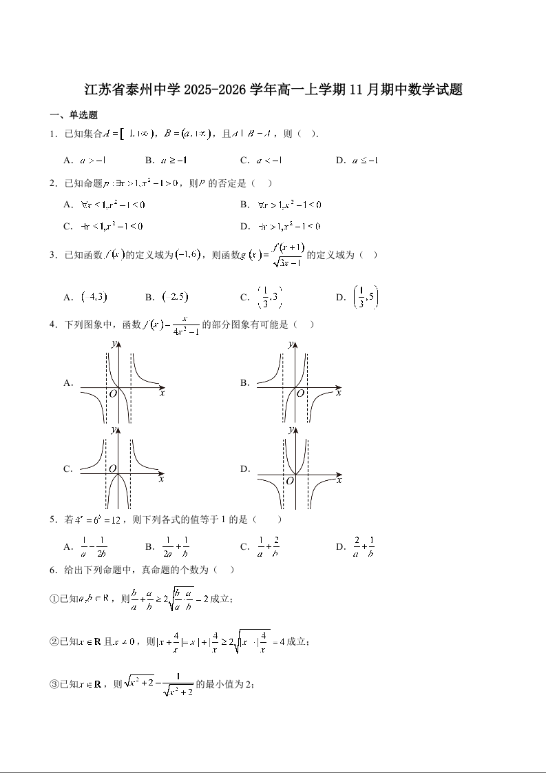 江苏省泰州中学2025-2026学年第一学期高一年级期中考试 数学试题(含答案).docx