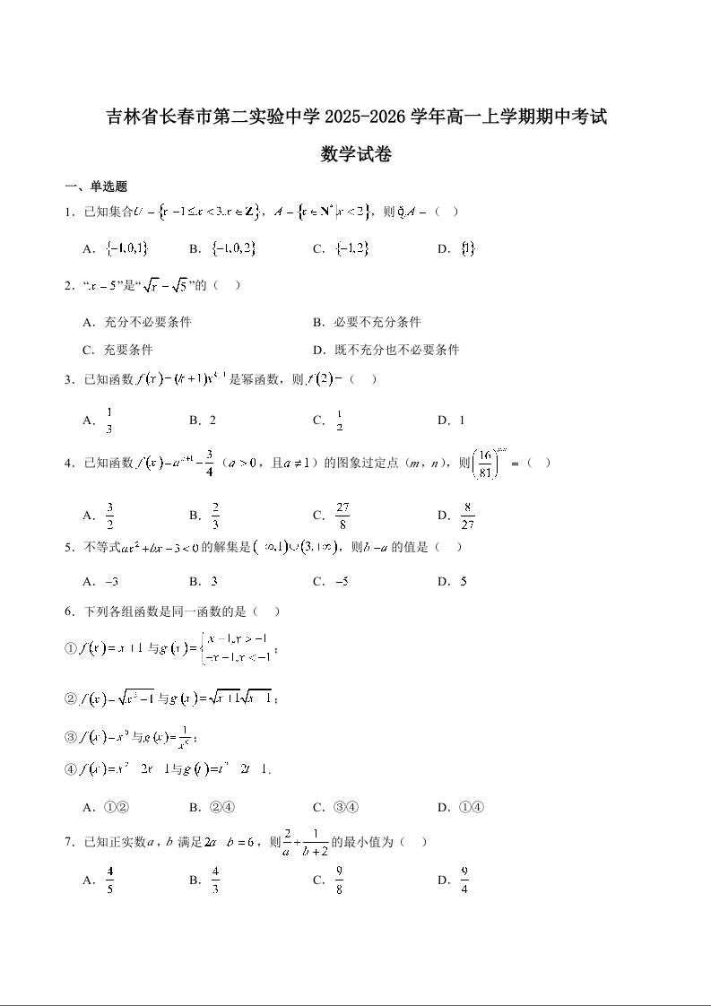 长春市第二实验中学2025-2026学年度高一上学期期中考试 数学试卷(含答案).docx