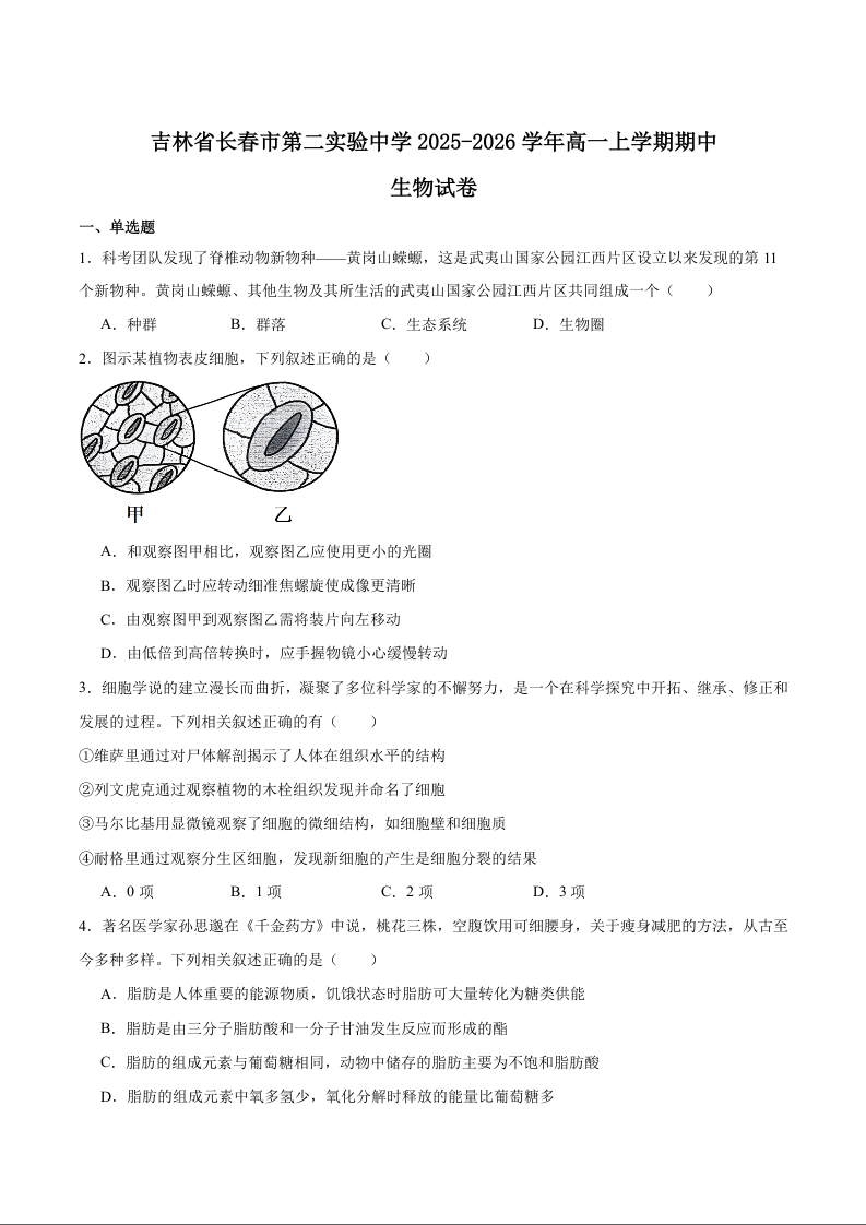 长春市第二实验中学2025-2026学年度高一上学期期中考试 生物试卷(含答案).docx