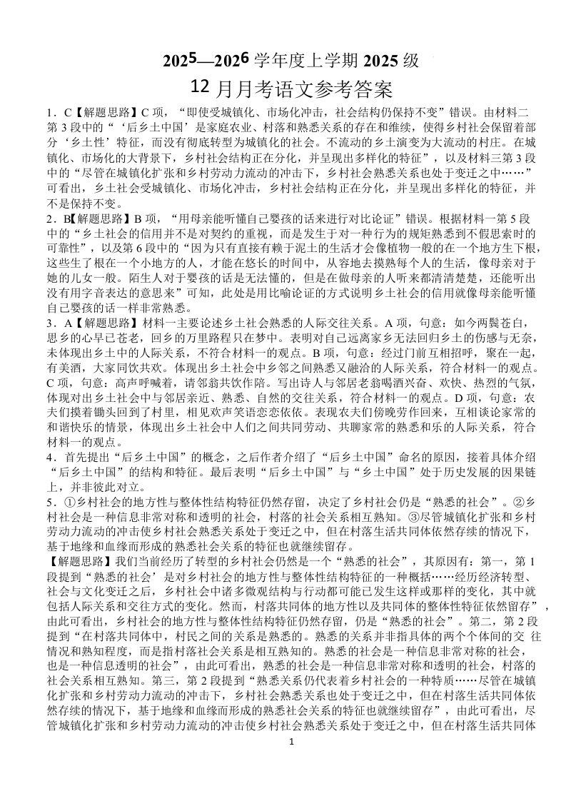 湖北省荆州市沙市中学2025-2026学年高一上学期12月月考 语文答案.docx