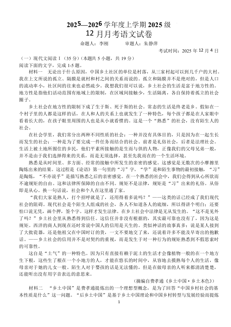 湖北省荆州市沙市中学2025-2026学年高一上学期12月月考 语文.docx