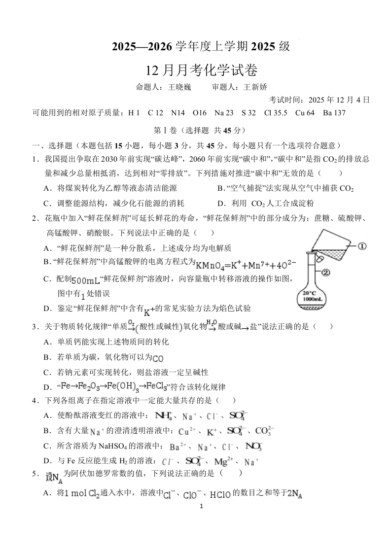 湖北省荆州市沙市中学2025-2026学年高一上学期12月月考 化学试题(含答案).docx