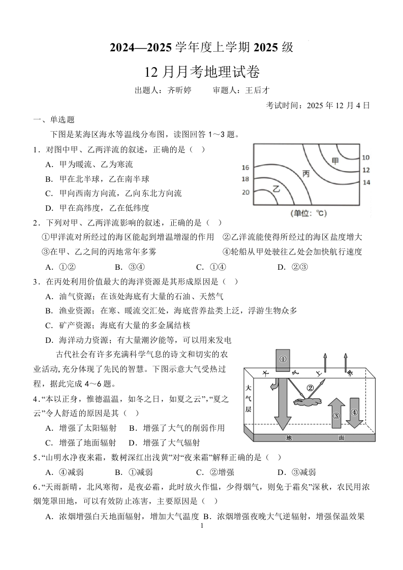 湖北省荆州市沙市中学2025-2026学年高一上学期12月月考 地理试题(含答案).docx