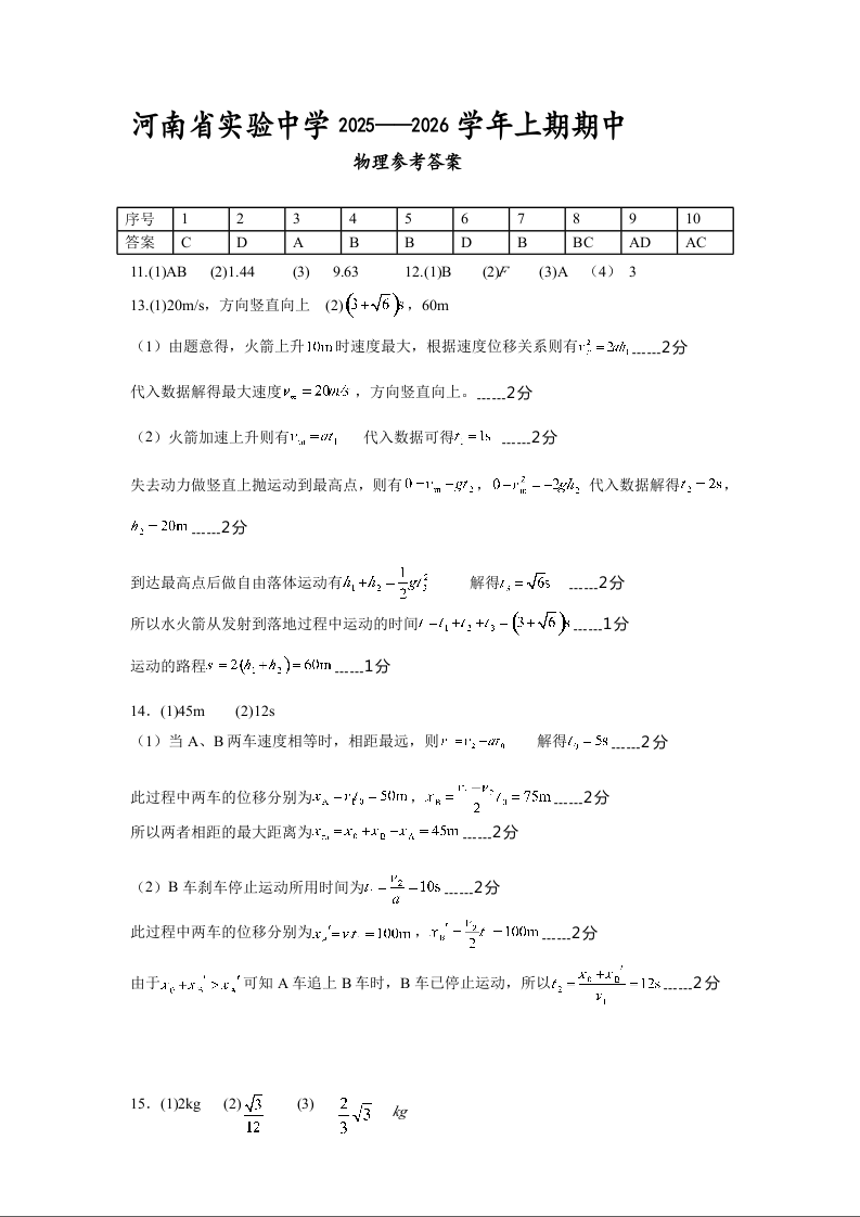 河南省实验中学2025-2026学年高一上学期期中考试 物理答案.docx