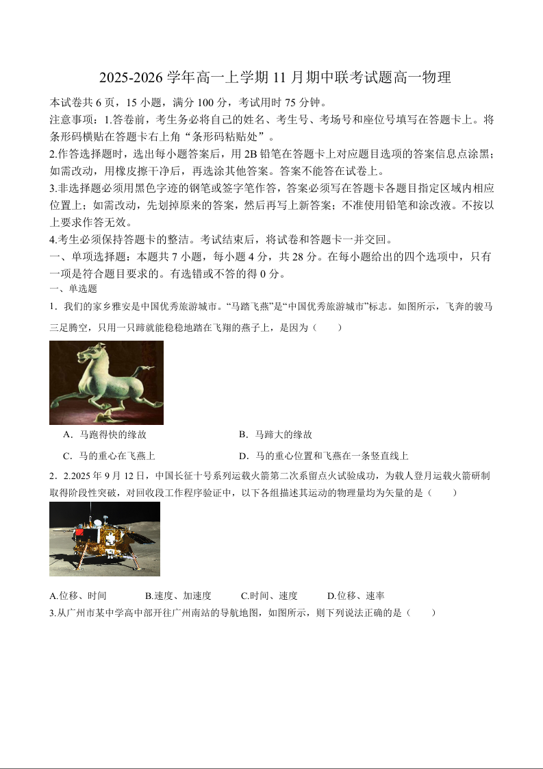 广东省揭阳市部分学校2025-2026学年高一上学期期中联考 物理试题(含答案).docx