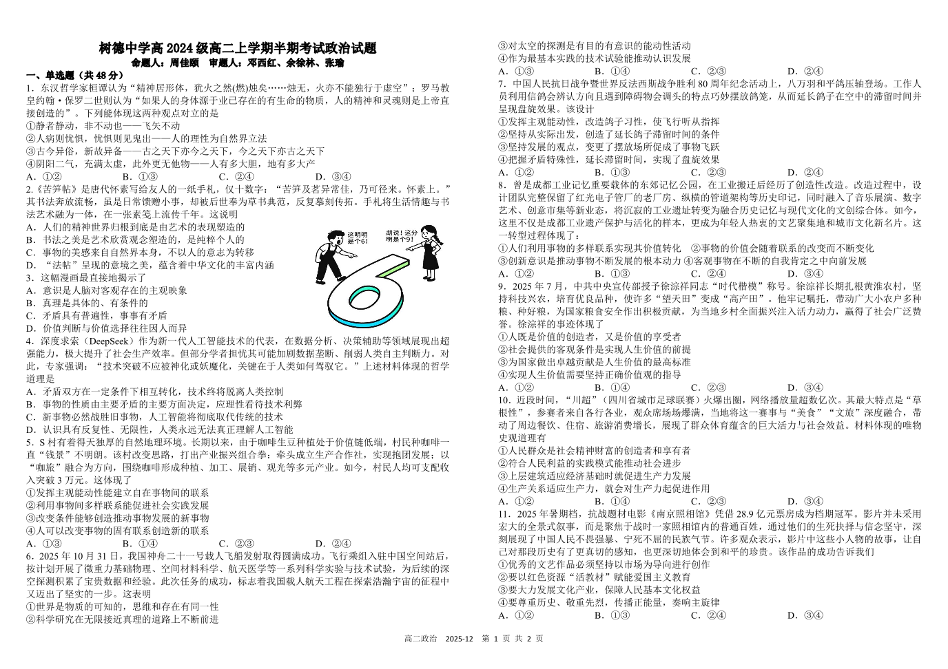 树德中学高2024级高二上学期半期考试 政治试题(含答案).pdf