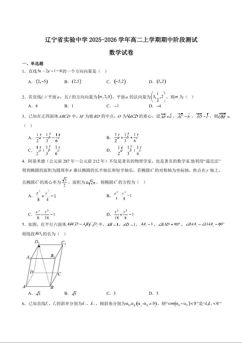 辽宁省实验中学2025年秋季学期高二上学期期中阶段测试 数学试题(含答案).docx