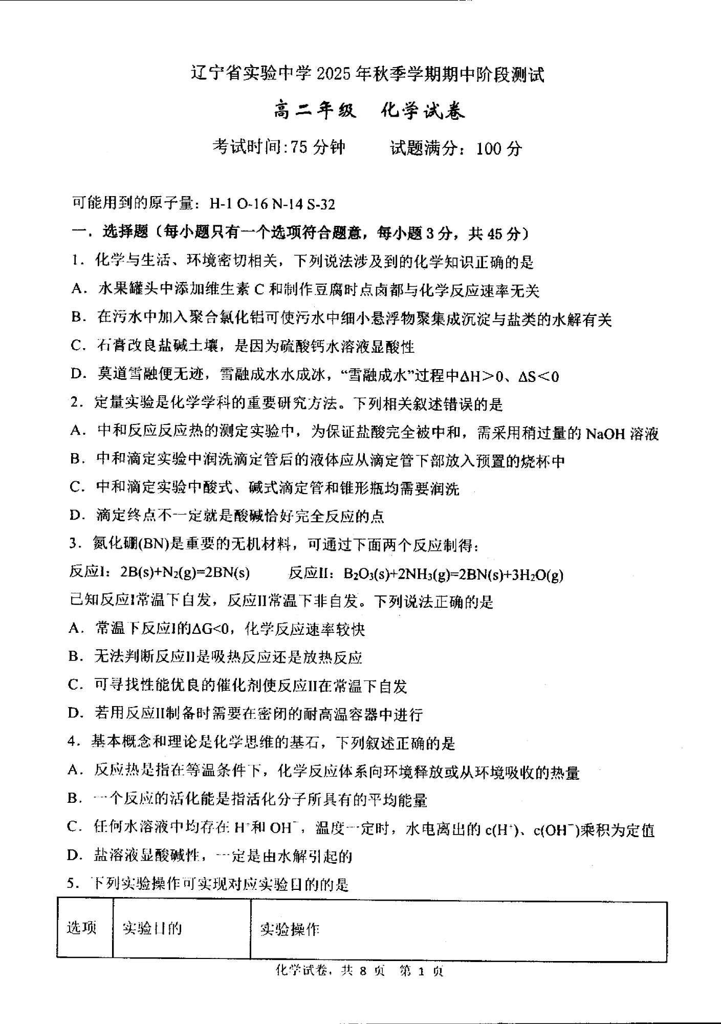 辽宁省实验中学2025年秋季学期高二上学期期中阶段测试 化学试题(含答案).pdf