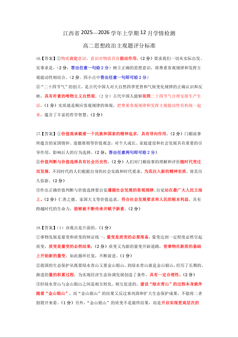 12月江西高二·政治主观题评分标准.docx
