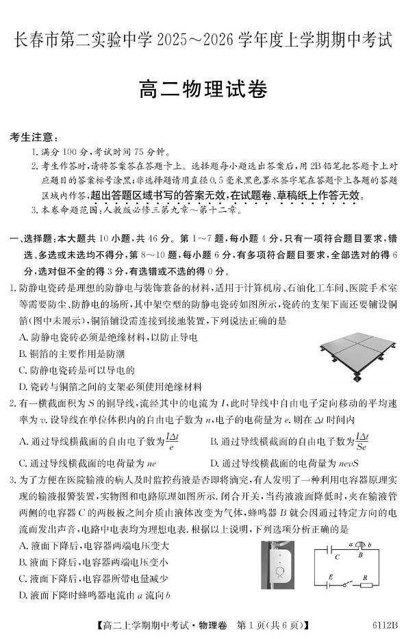 长春市第二实验中学2025-2026学年度高二上学期期中考试 物理试卷(含答案).pdf