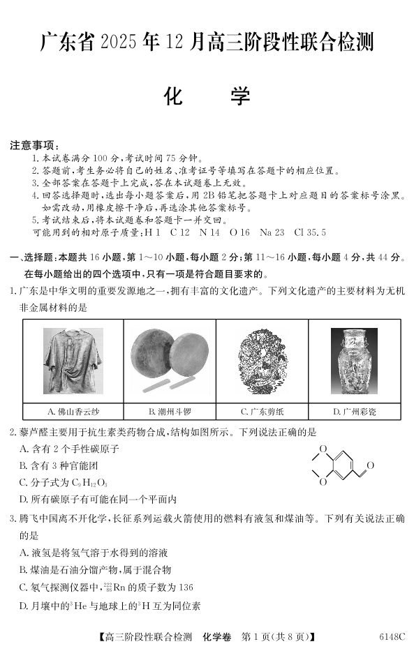 广东省2025年12月高三阶段性联合检测 化学.pdf