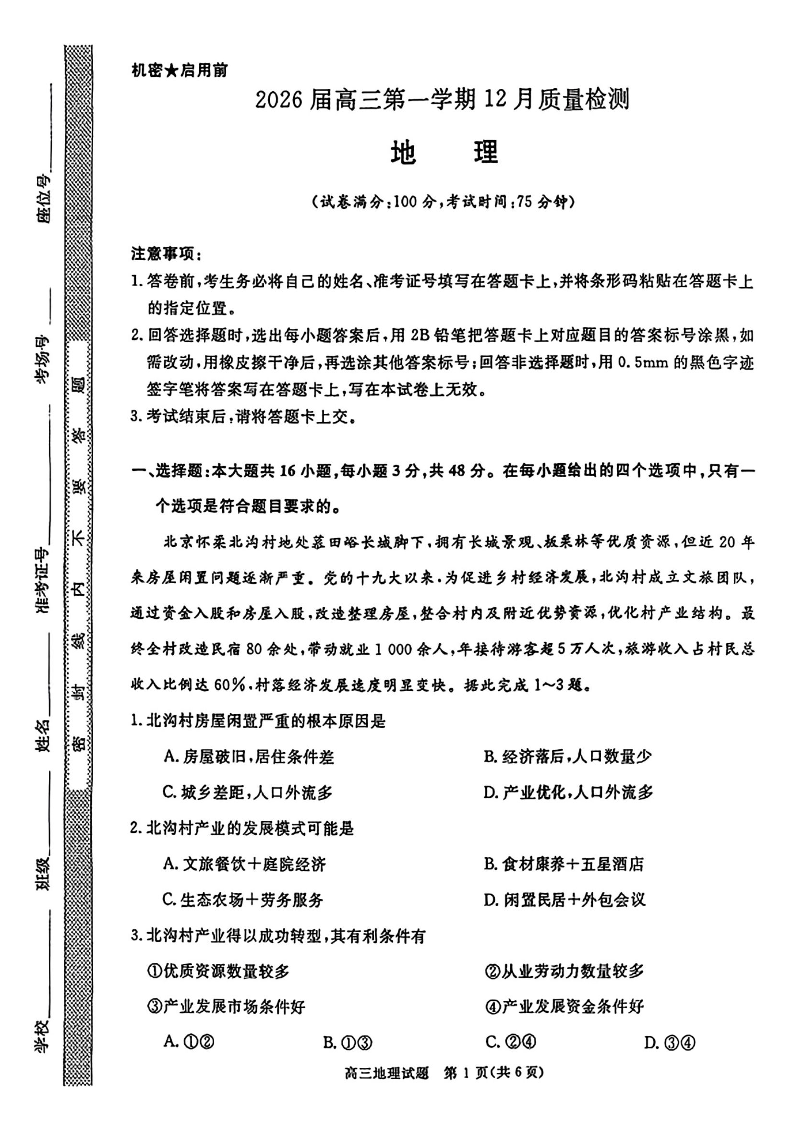 华师联盟2026届高三第一学期12月质量检测 地理试题(含答案).pdf