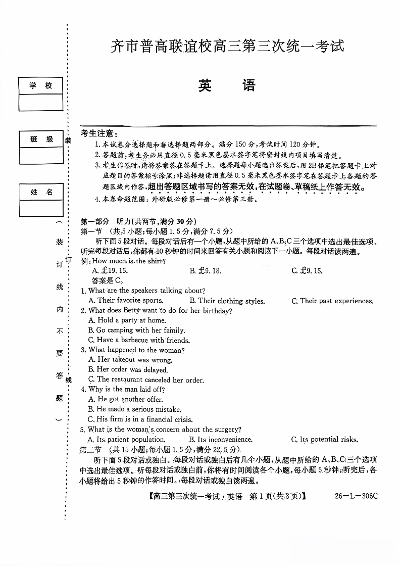 齐市普高联谊校高三第三次统一考试 英语.pdf