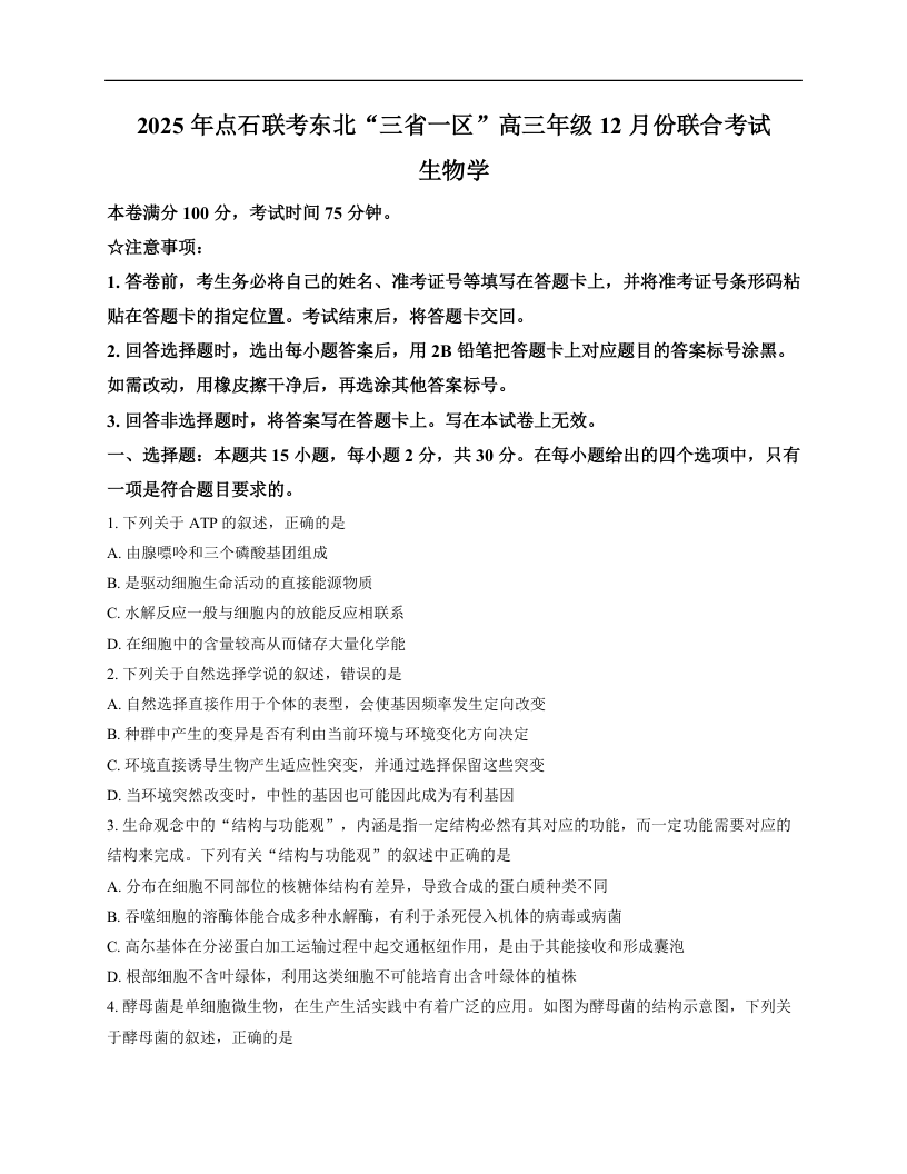 2025年点石联考东北“三省一区”高三年级12月份联合考试 生物.docx