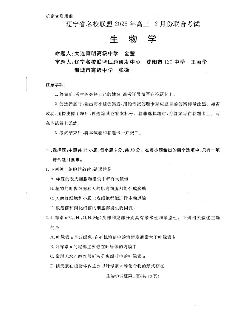 辽宁省名校联盟2025年高三12月份联合考试 生物.pdf