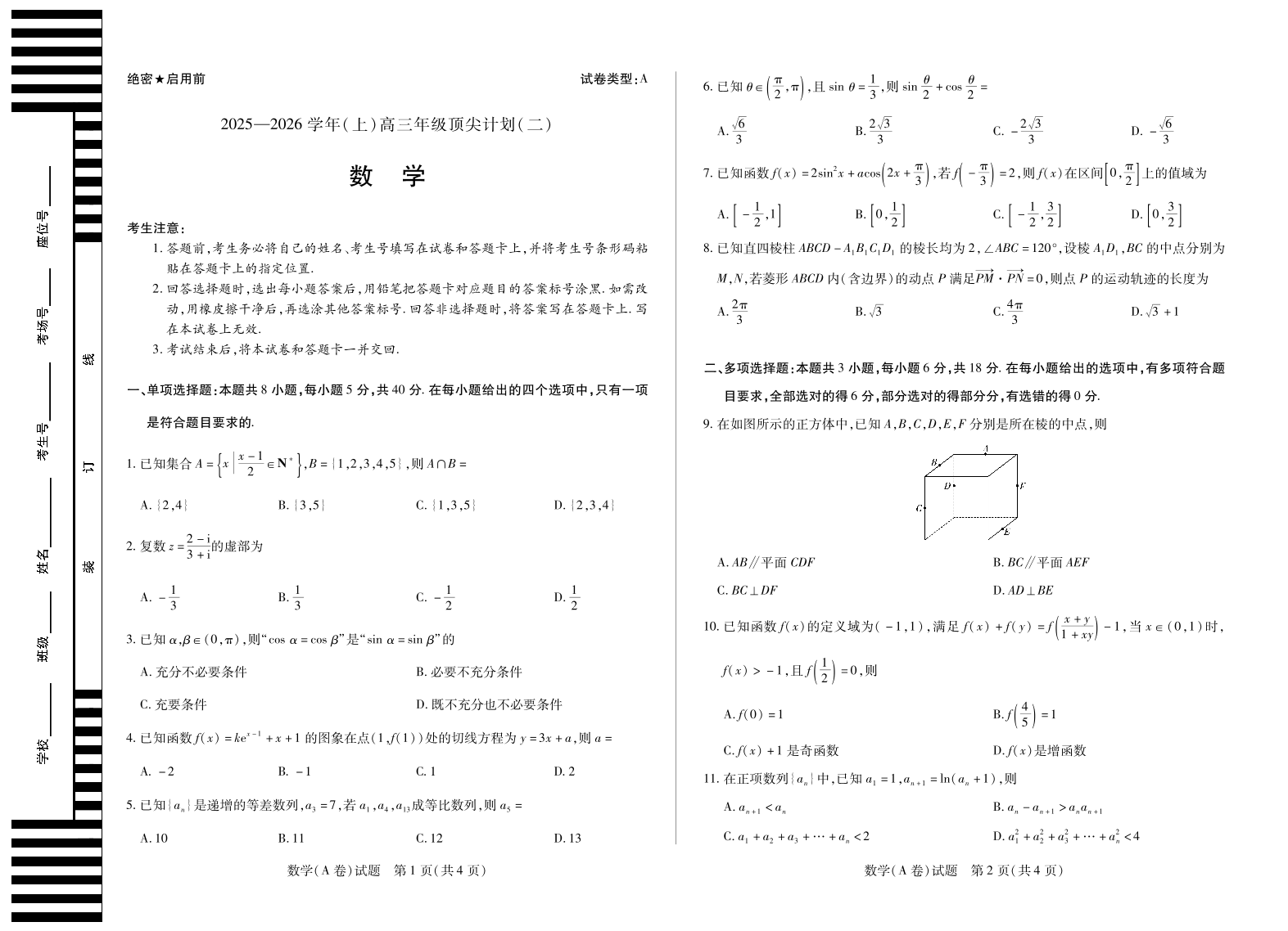 数学A卷 天一大联考·河南省、陕西甘肃省2025-2026学年(上)高三年级顶尖计划(二).pdf