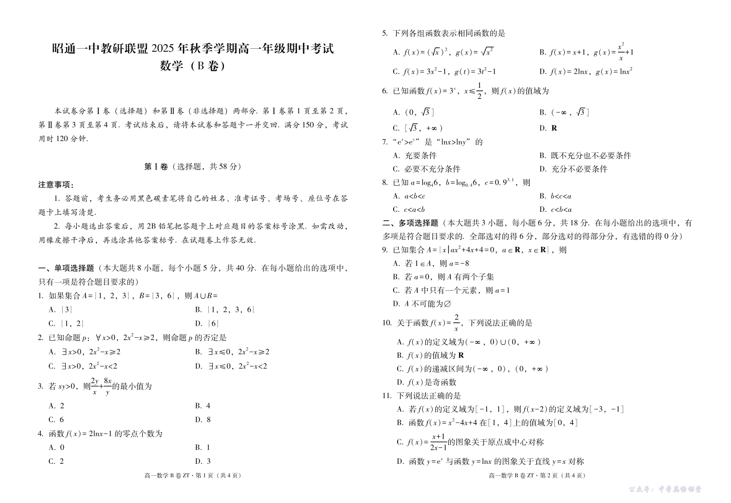 云南省昭通一中教研联盟2025-2026学年高一上学期期中考试 数学(B).pdf