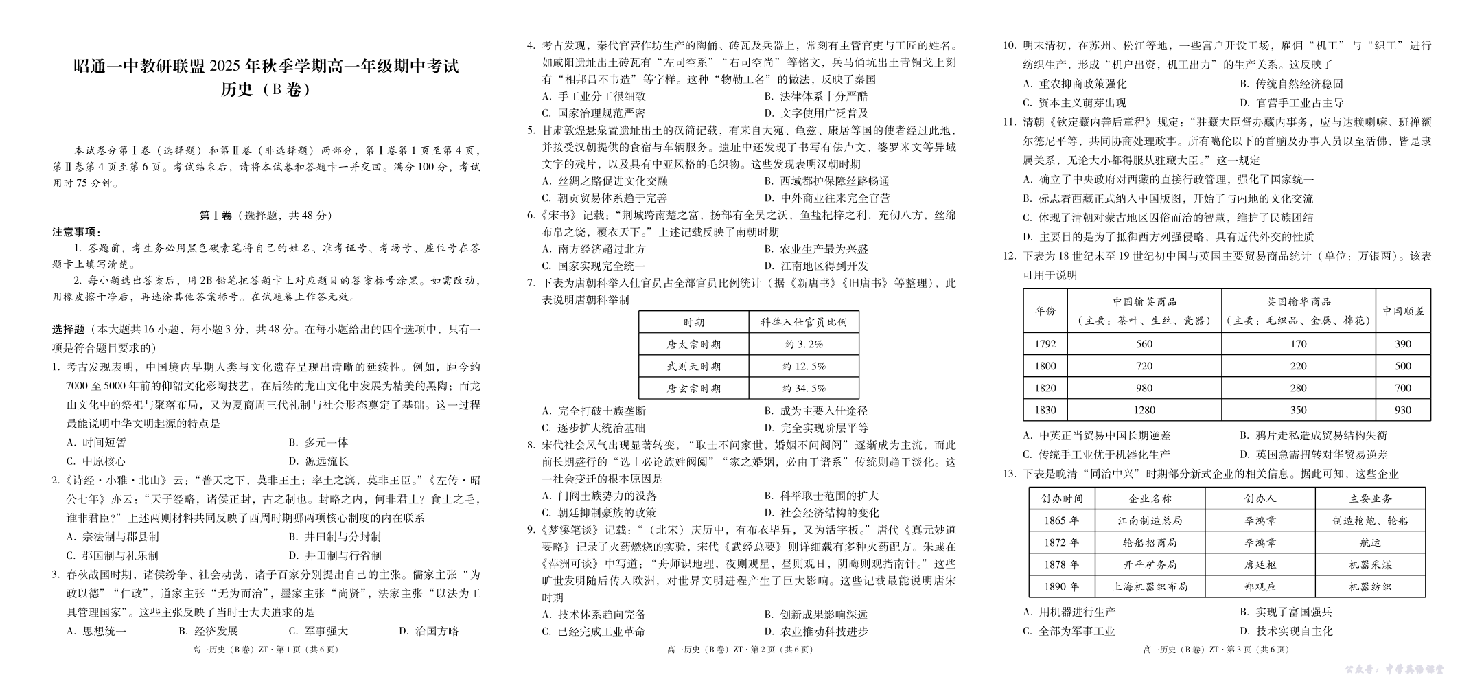云南省昭通一中教研联盟2025-2026学年高一上学期期中考试 历史(B).pdf