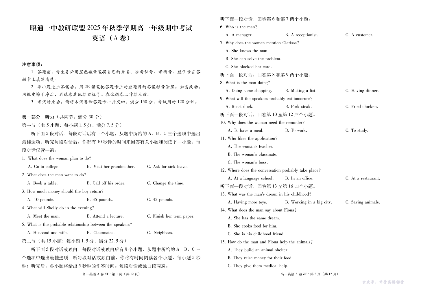云南省昭通一中教研联盟2025-2026学年高一上学期期中考试 英语(A).pdf