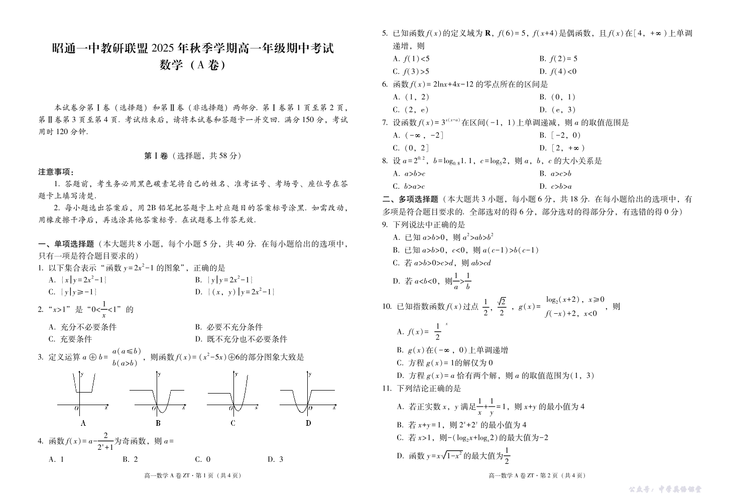 云南省昭通一中教研联盟2025-2026学年高一上学期期中考试 数学(A).pdf