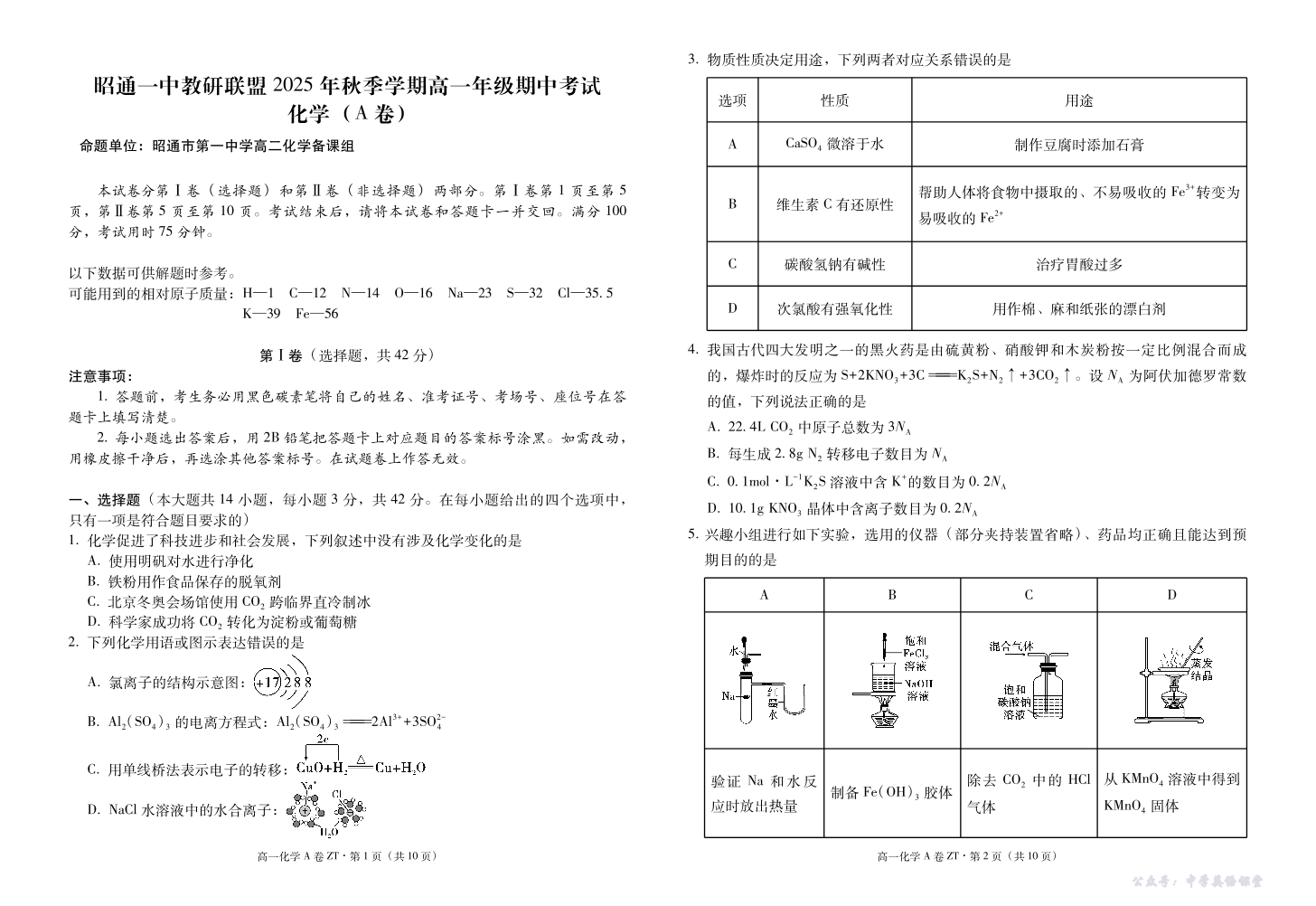 云南省昭通一中教研联盟2025-2026学年高一上学期期中考试 化学(A).pdf