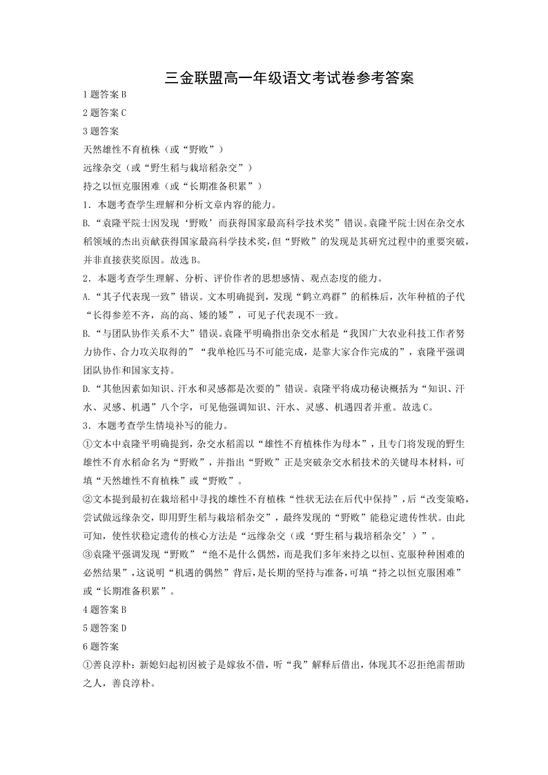 山西省三金联盟2025-2026学年高一年级第一次联合考试 语文答案.pdf