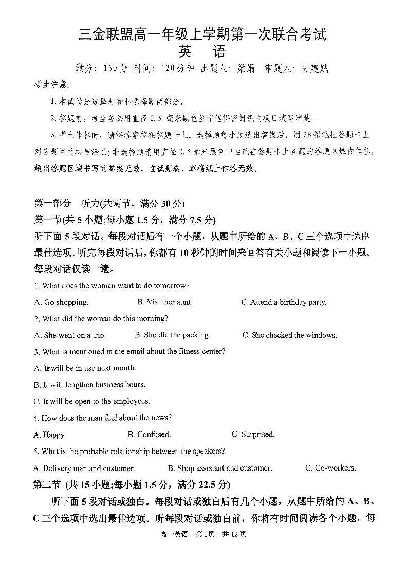 山西省三金联盟2025-2026学年高一年级第一次联合考试 英语.pdf