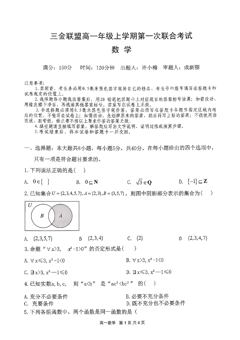 山西省三金联盟2025-2026学年高一年级第一次联合考试 数学.pdf