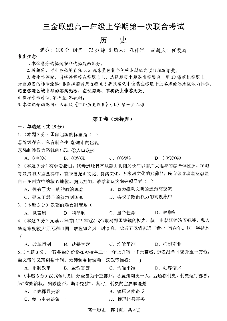 山西省三金联盟2025-2026学年高一年级第一次联合考试 历史.pdf