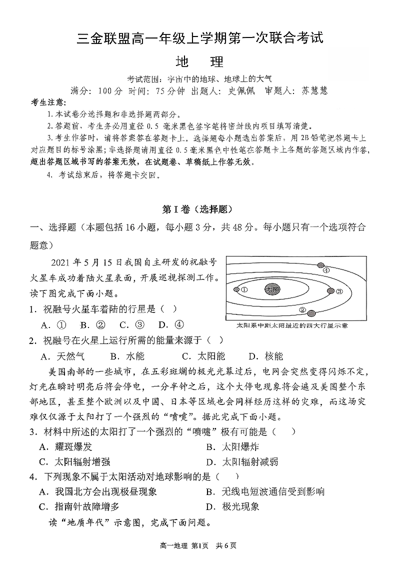 山西省三金联盟2025-2026学年高一年级第一次联合考试 地理.pdf