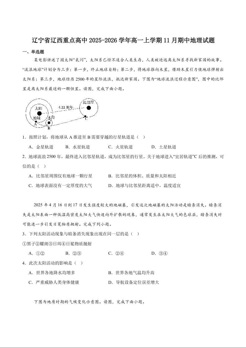 辽宁省辽西重点高中2025-2026学年高一上学期期中考试 地理试题(含答案).docx