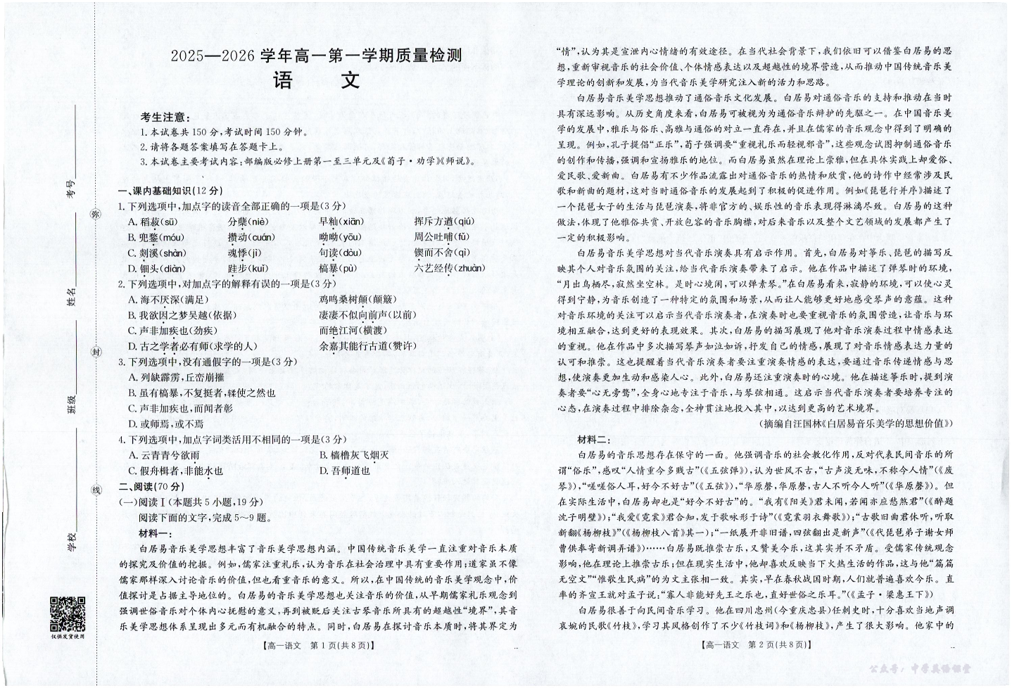 南平市2025-2026学年高一第一学期质量检测 语文.pdf