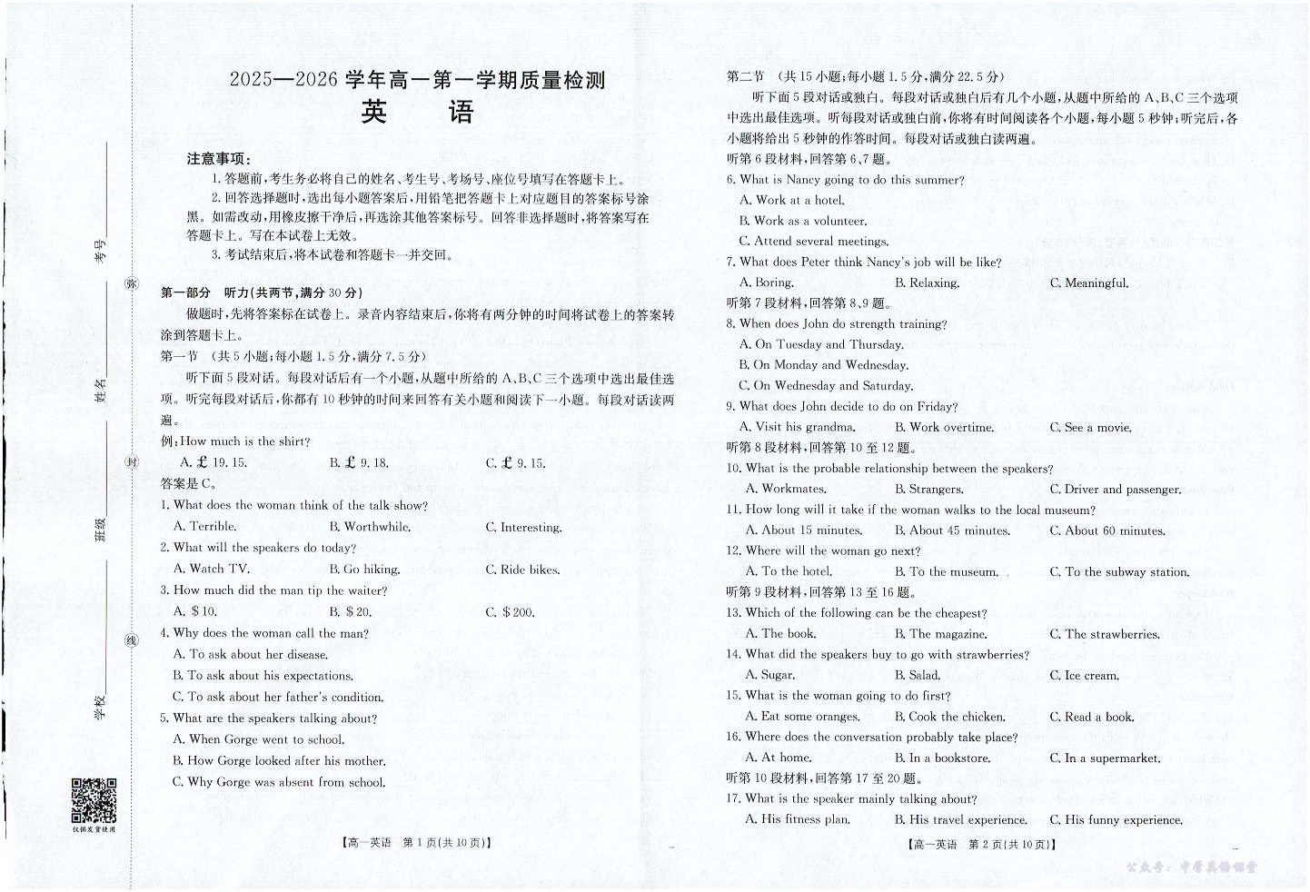 南平市2025-2026学年高一第一学期质量检测 英语.pdf