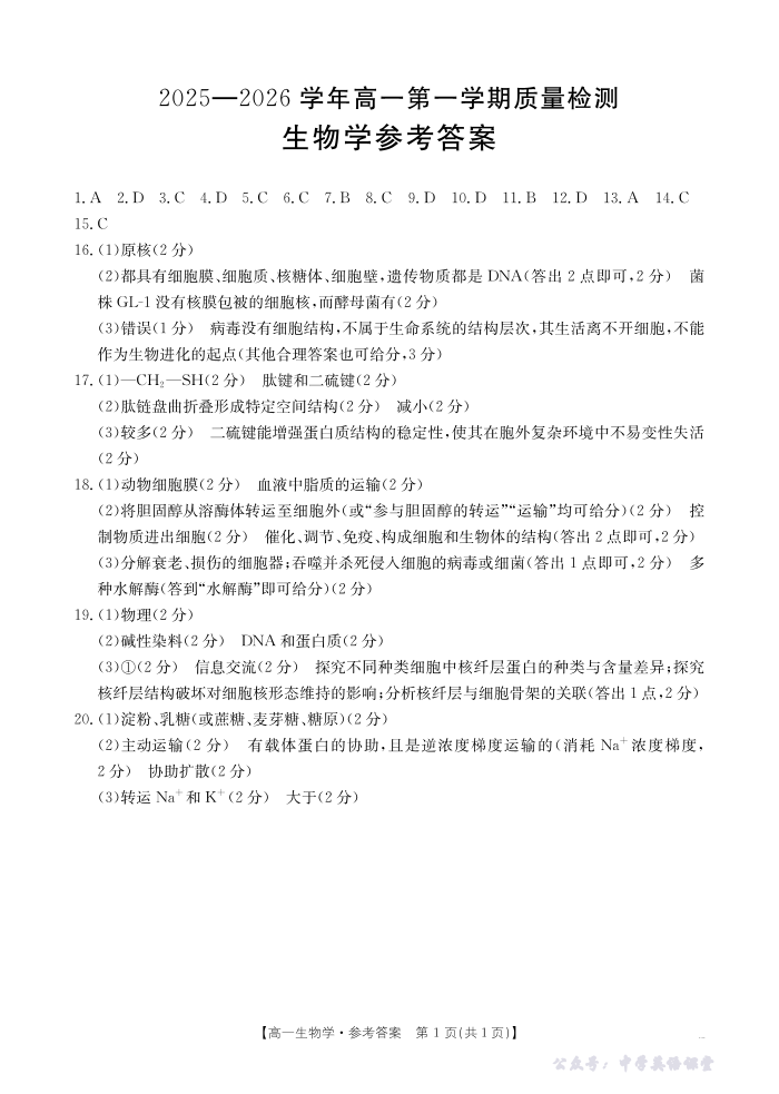 南平市2025-2026学年高一第一学期质量检测 生物答案.pdf