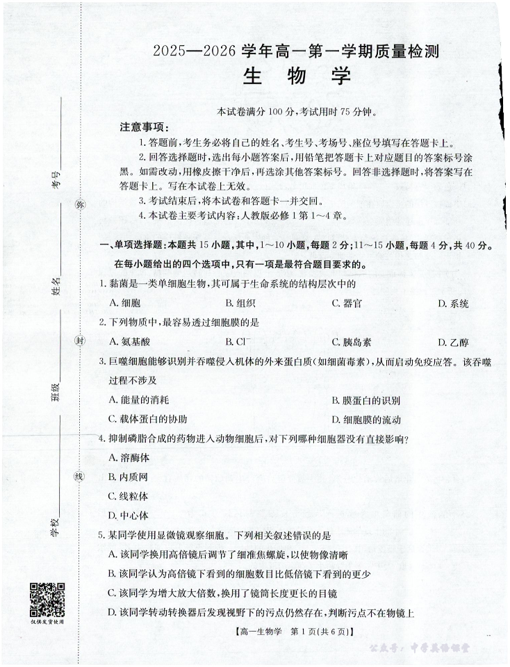 南平市2025-2026学年高一第一学期质量检测 生物.pdf