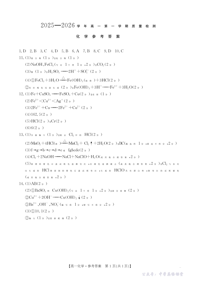 南平市2025-2026学年高一第一学期质量检测 化学答案.pdf