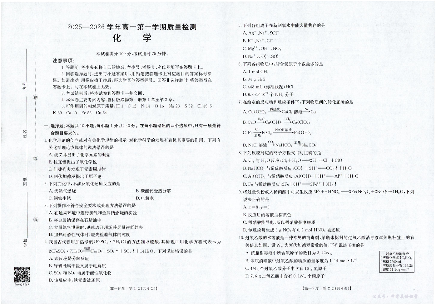 南平市2025-2026学年高一第一学期质量检测 化学.pdf