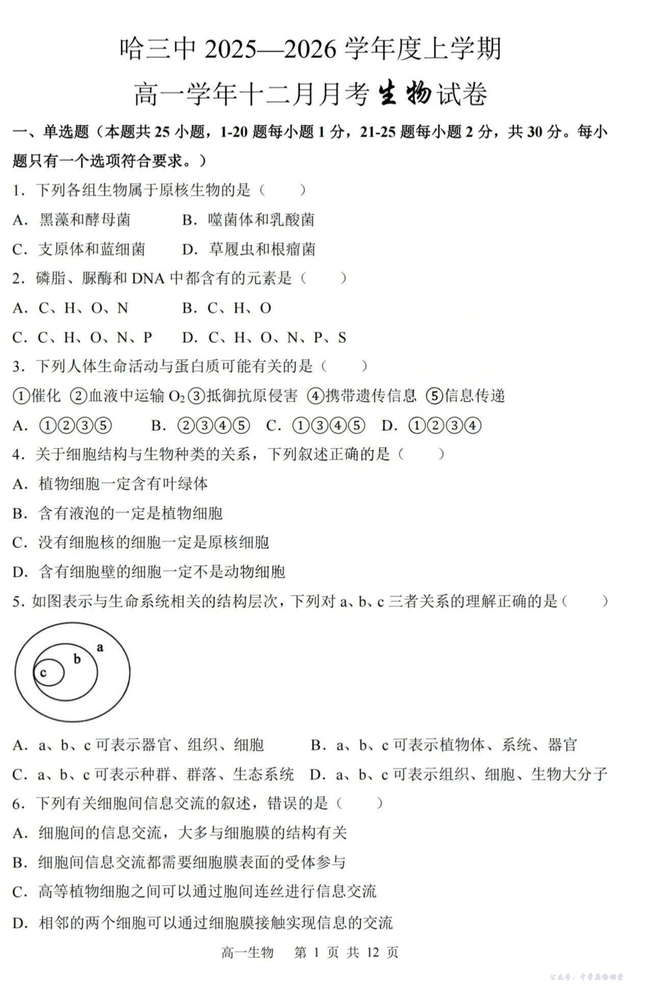 黑龙江省哈三中2025-2026学年上学期高一学年十二月月考 生物试题(含答案).pdf