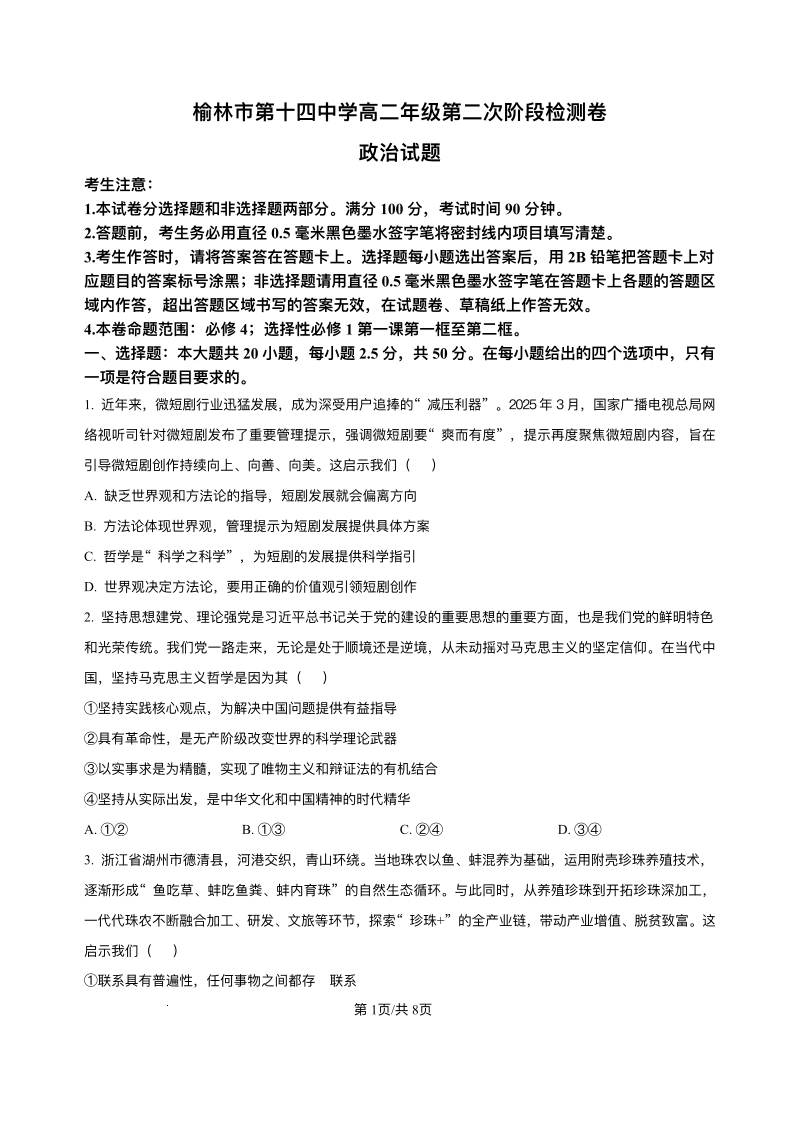 陕西省榆林市榆阳区2025-2026学年高二上学期12月期中考试 政治试题(含答案).pdf