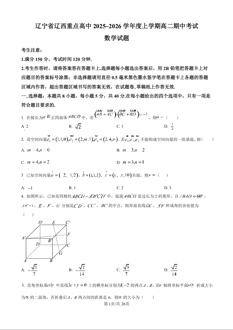 辽宁省辽西重点高中2025-2026学年高二上学期期中考试 数学试题(含答案).docx