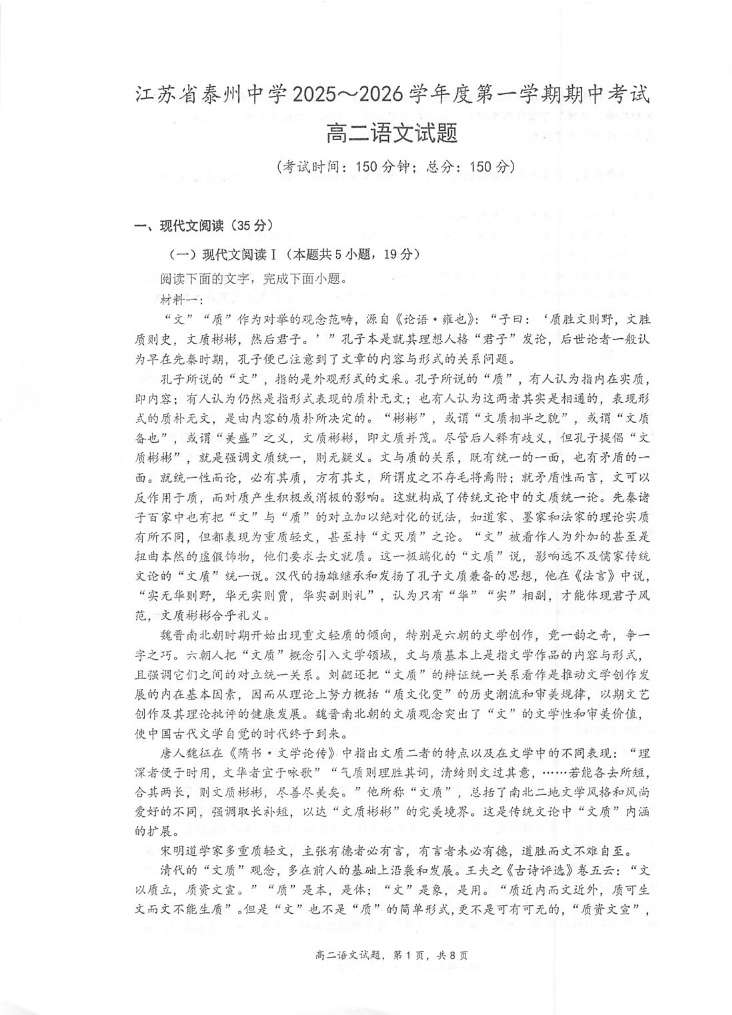 江苏省泰州中学2025-2026学年度第一学期高二年级期中考试 语文试题(含答案).pdf